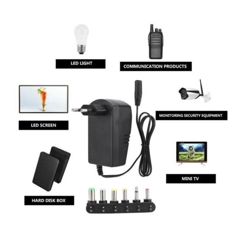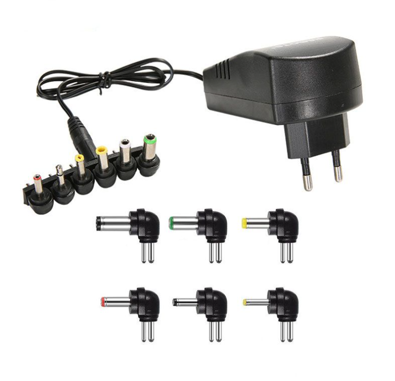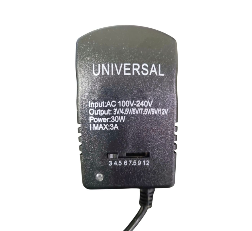 Selectable Output Voltages: 3 V, 4.5 V, 6 V, 7.5 V, 9 V, and 12 V – switched via a selector (e.g., dial or toggle) on the adapte